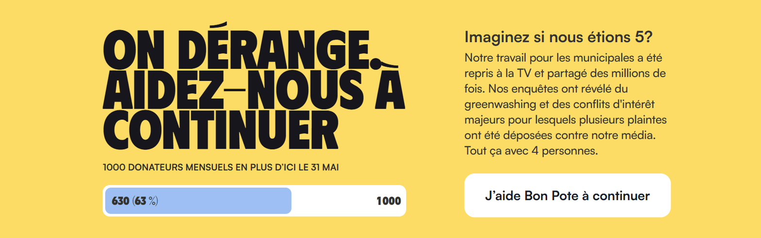 Vous le savez, depuis septembre, beaucoup de choses ont changé chez Bon Pote. L'équipe est passée d'une seule personne à temps plein à 4, ce qui nous a permis de couvrir plus de sujets, de lancer un pôle enquêtes, de créer de nouveaux outils…Cette évolution méritait qu'on prenne du recul pour clarifier qui nous sommes, et où nous allons. C'est chose faite : dès ce lundi, nous vous dévoilons le nouveau cap de Bon Pote. Restez à l'affût !