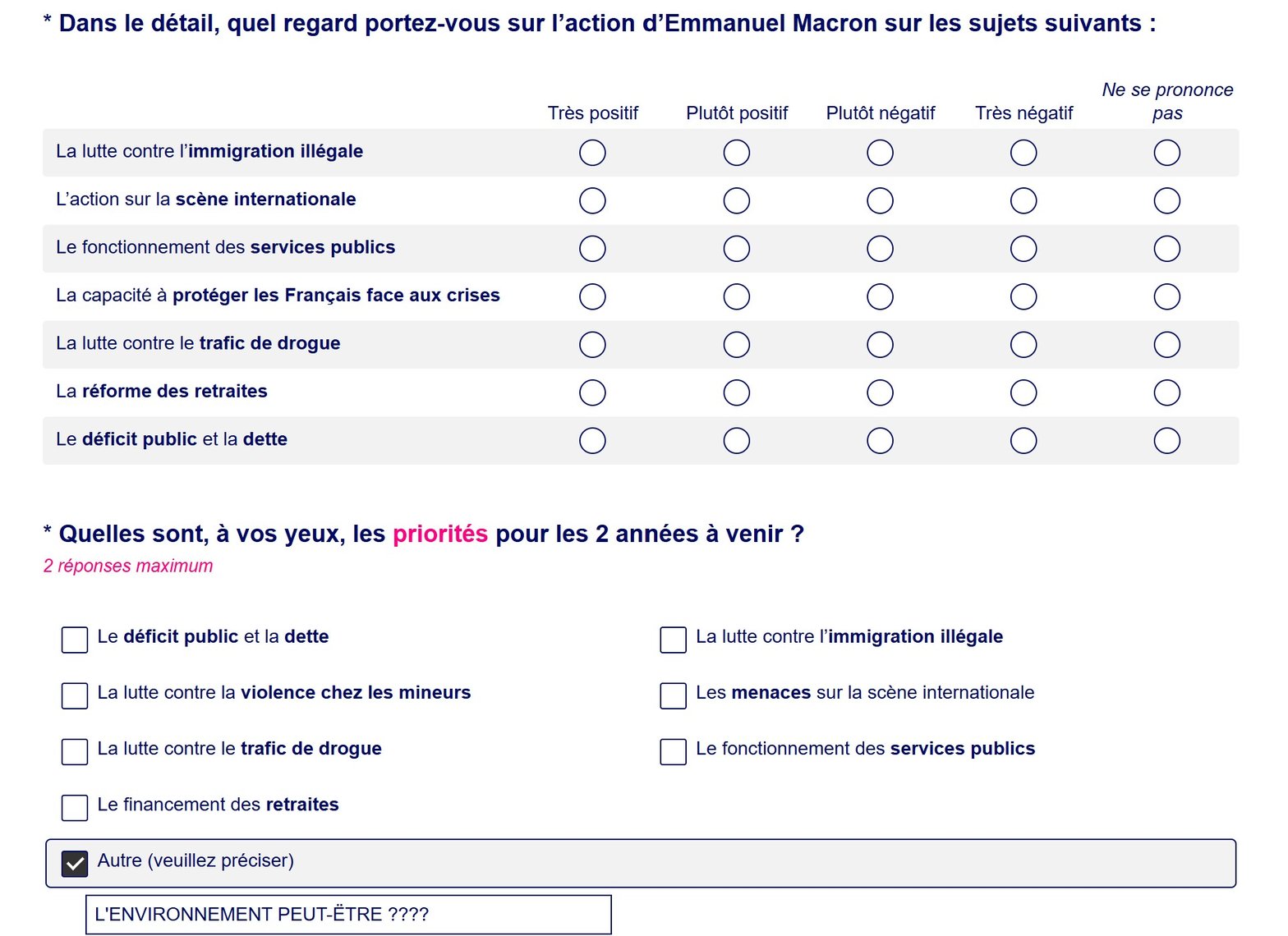 Ce soir, Emmanuel macron sera interviewé pendant deux heures par 6 personnes, et il est possible de poster des questions en amont au Président. Pour l'occasion, TF1 a eu la très bonne idée de préparer un questionnaire où les Français peuvent donner leur avis afin de pousser certains sujets.