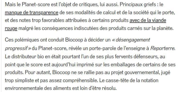 Nous venons d'apprendre dans Reporterre que Biocoop a décidé "un désengagement progressif du Planet-Score" ! Notre enquête (et les menaces reçues) semble avoir réveillé certaines enseignes sur la réalité du Planet-Score...