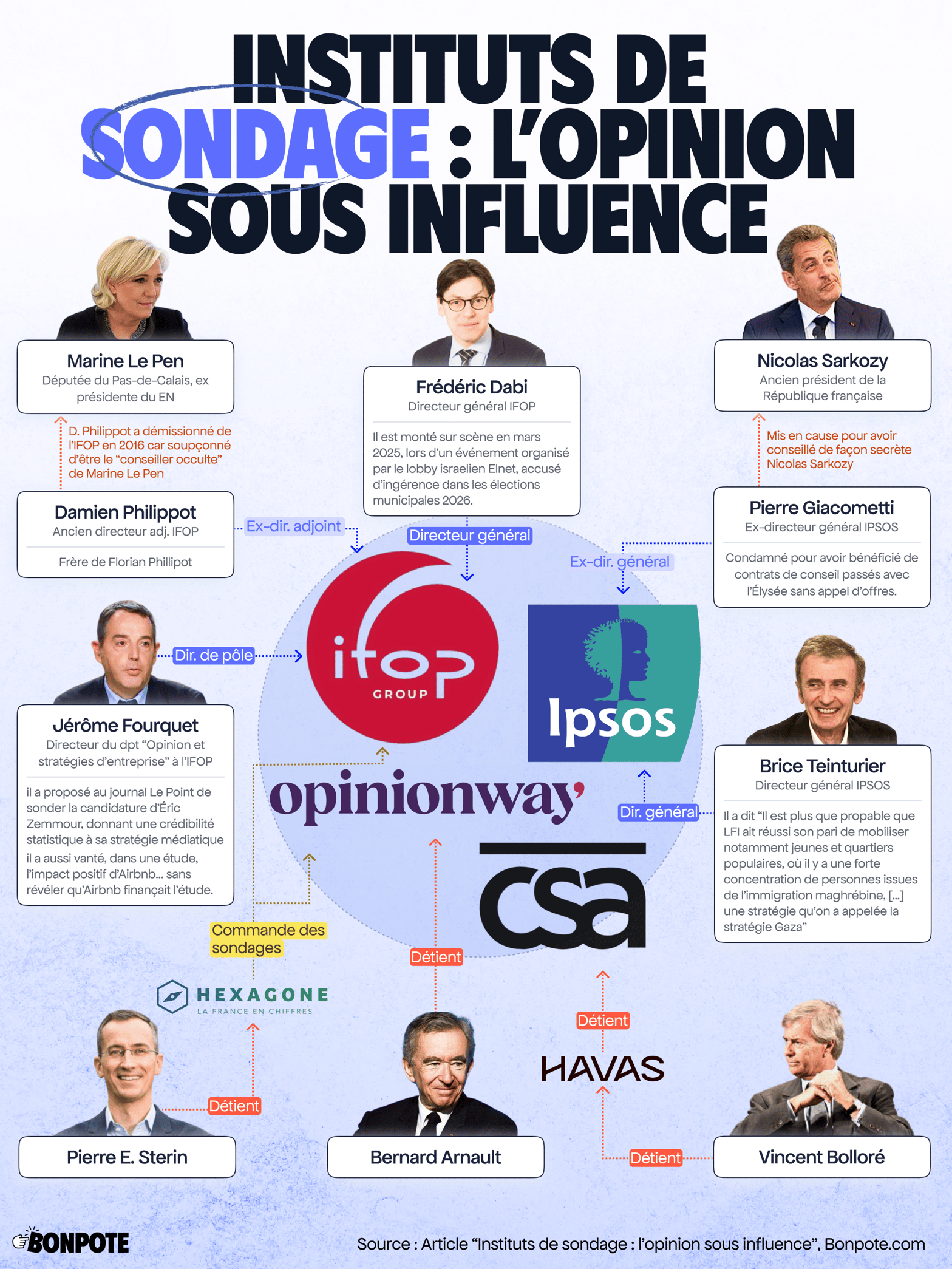 Une poignée de directeurs d’instituts de sondage dictent l’agenda politique et impriment leurs analyses souvent conservatrices. Derrière certains d’entre eux, des milliardaires engagés dans une guerre culturelle. Bon Pote a enquêté sur les dessous des instituts de sondage :